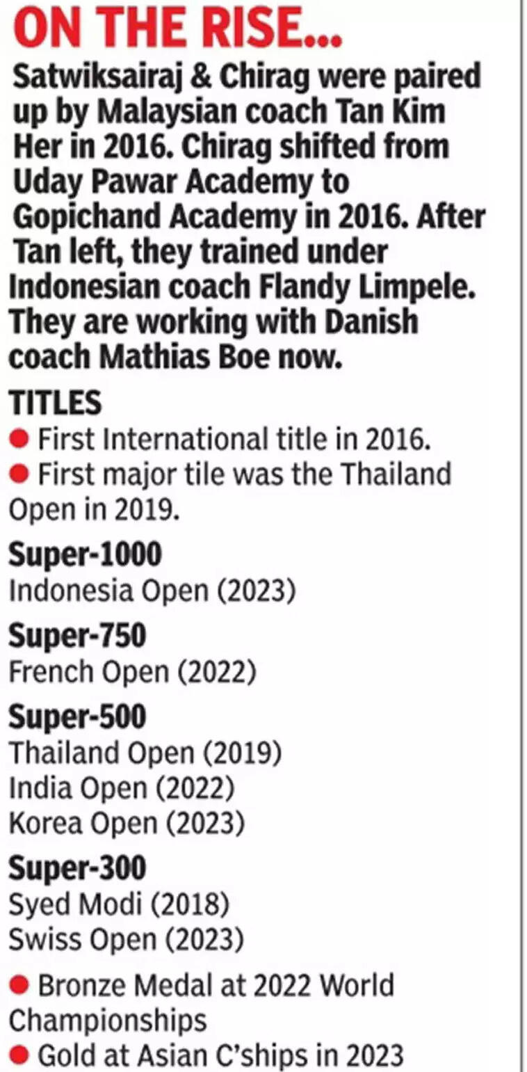 NEW DELHI: India's top men's doubles pair, Chirag Shetty and Satwiksairaj Rankireddy, have soared to a career-best second spot in the latest Badminton World Federation (BWF) rankings after their recent triumph at the Korea Open.