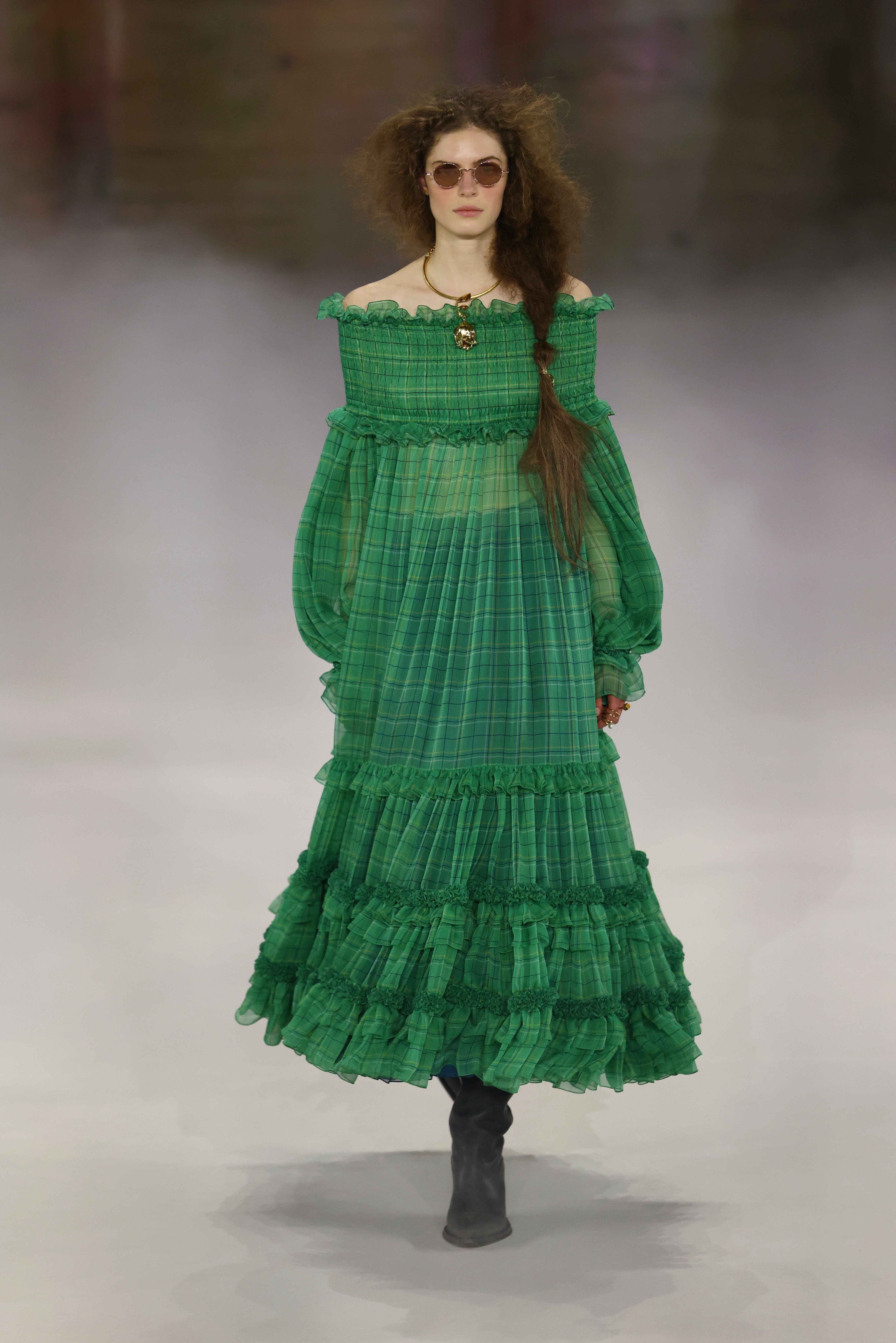 Elsewhere, an emerald green plaid dress captured the essence of Chloé’s romantic identity. Featuring an off-the-shoulder design, the dress had smocked detailing and voluminous sleeves, while tiered ruffles built volume throughout the skirt.