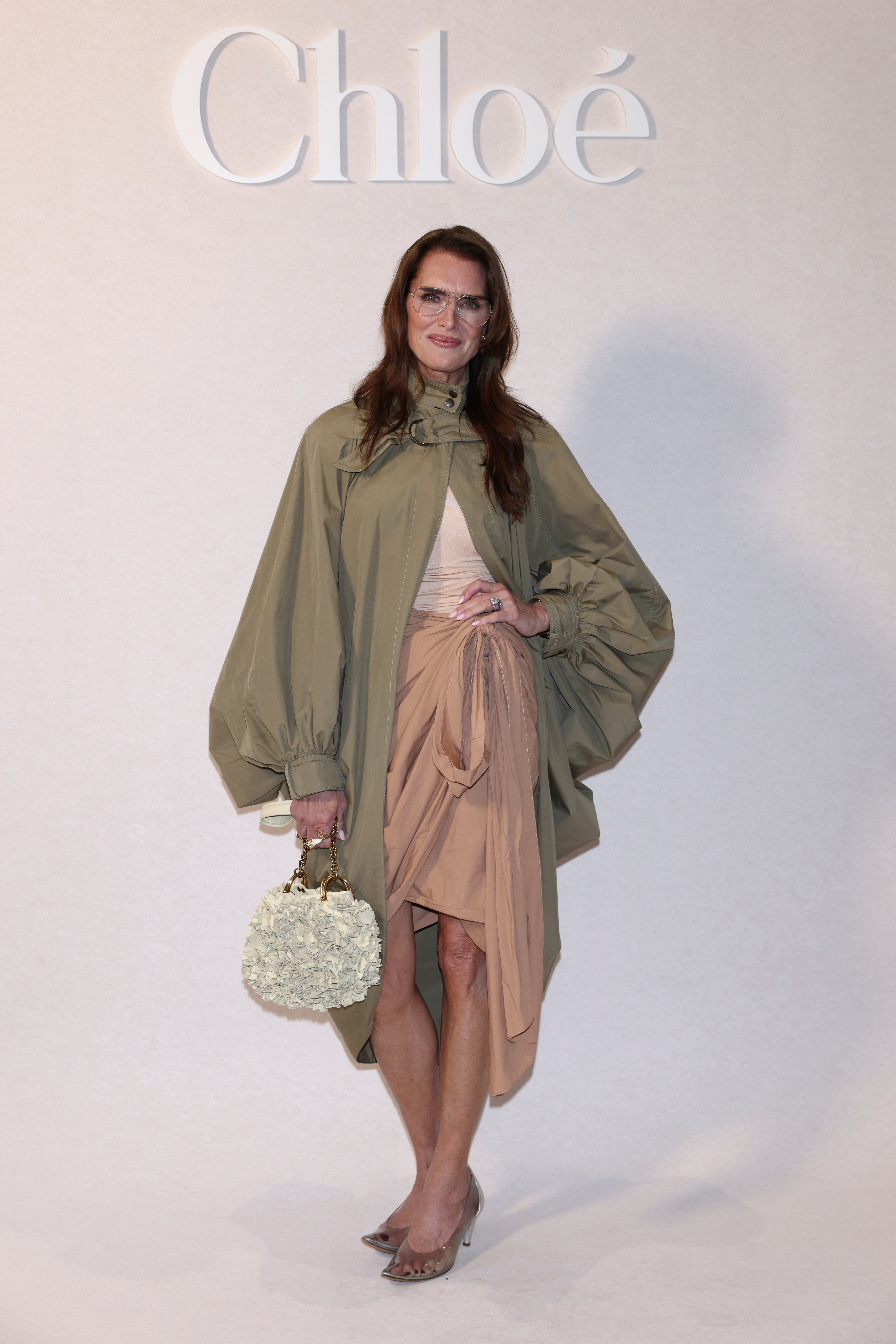 Brooke Shields chose a polished Chloé ensemble, stepping out in a balloon-sleeved khaki coat over a ruched skirt that echoed the house’s relaxed elegance.