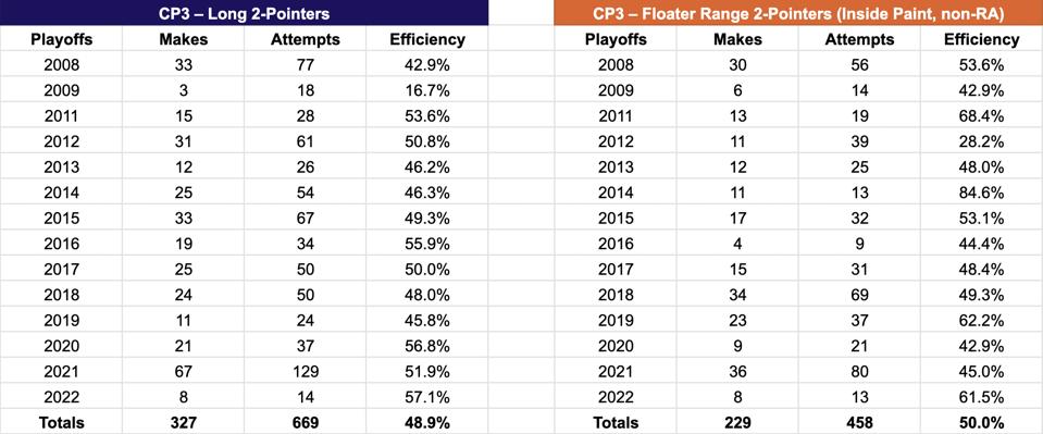 As a playoff performer, Paul is arguably the best mid-range shooter of the last 25-plus years. He has shot 48.9% on long twos and exactly 50.0% in the floater range during his playoff career: