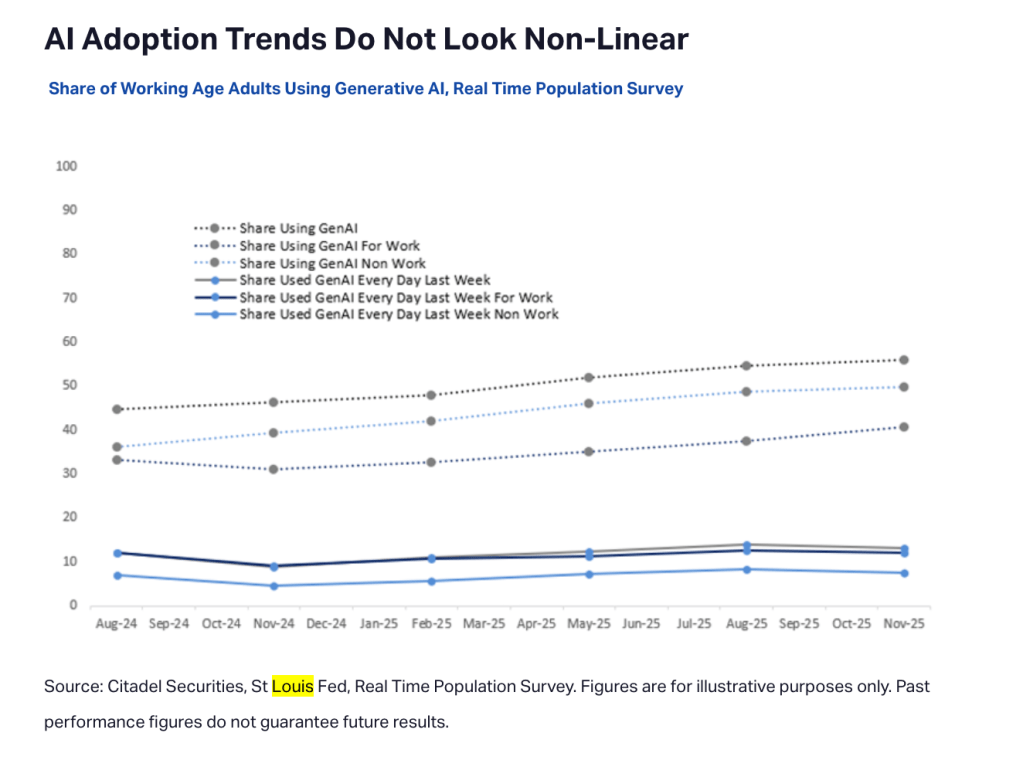 Furthermore, the data on AI diffusion completely contradicts the idea of an overnight white-collar wipeout. Using the St. Louis Fed’s analysis of the Real-Time Population Survey, Citadel notes that the daily use of generative AI for work is remaining “unexpectedly stable” and currently “presents little evidence of any imminent displacement risk.” Instead of a collapsing economy, new business formation in the U.S. is rapidly expanding, and the construction of massive AI data centers is currently driving a localized boom in construction hiring.