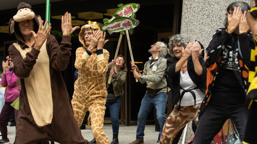 The upward sweep of the smoked-glass windows of Chase Tower offered no clues, as the protestors finished their dance routine to the Bee Gees’ disco hit, “Stayin’ Alive” and then fell to the ground — a mock mass death to illustrate what they see as the potential perils of climate change.