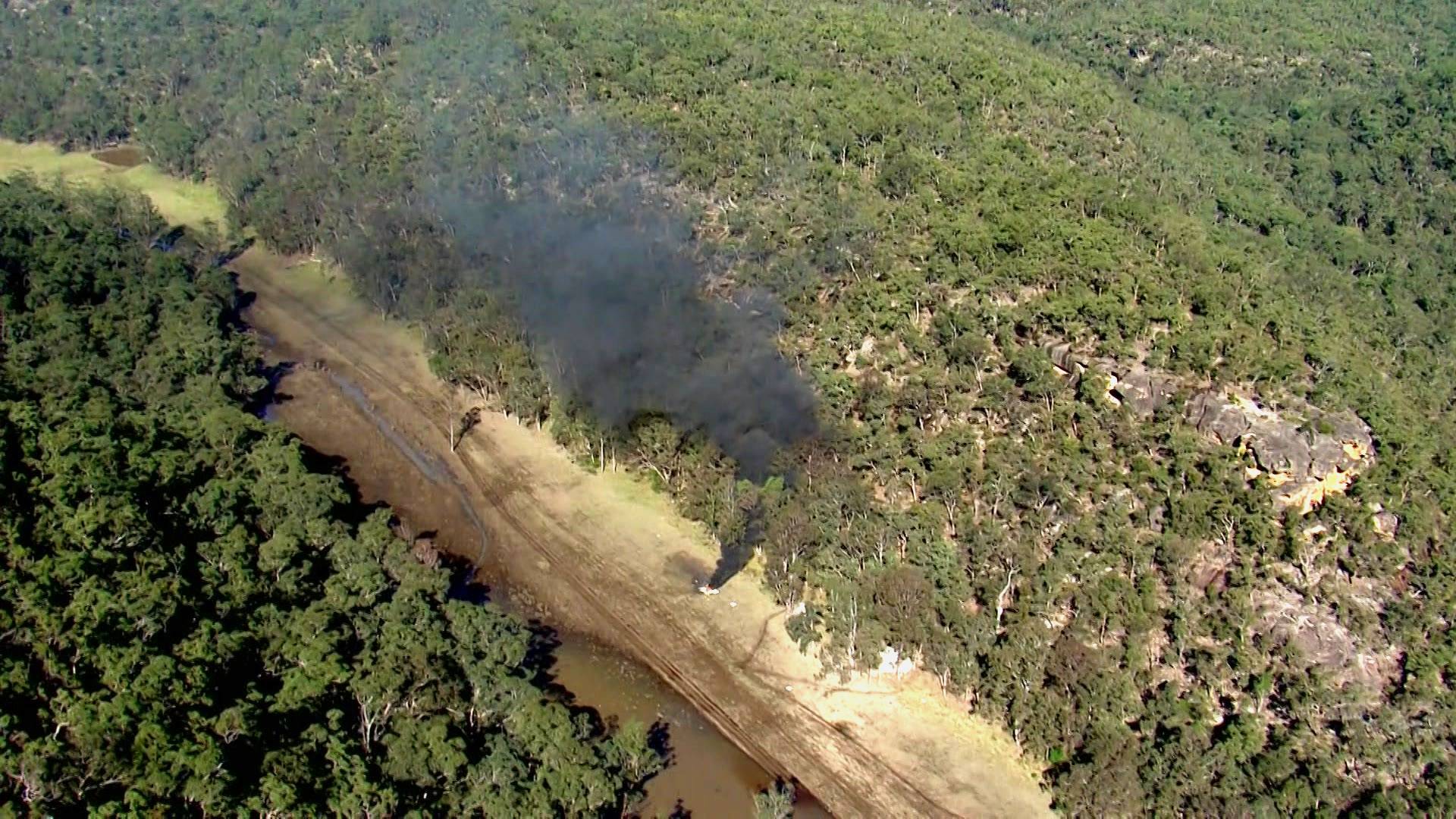 Black smoke issues from the burning helicopter wreckage at South Maroota in Sydney's north-west. (ABC News)