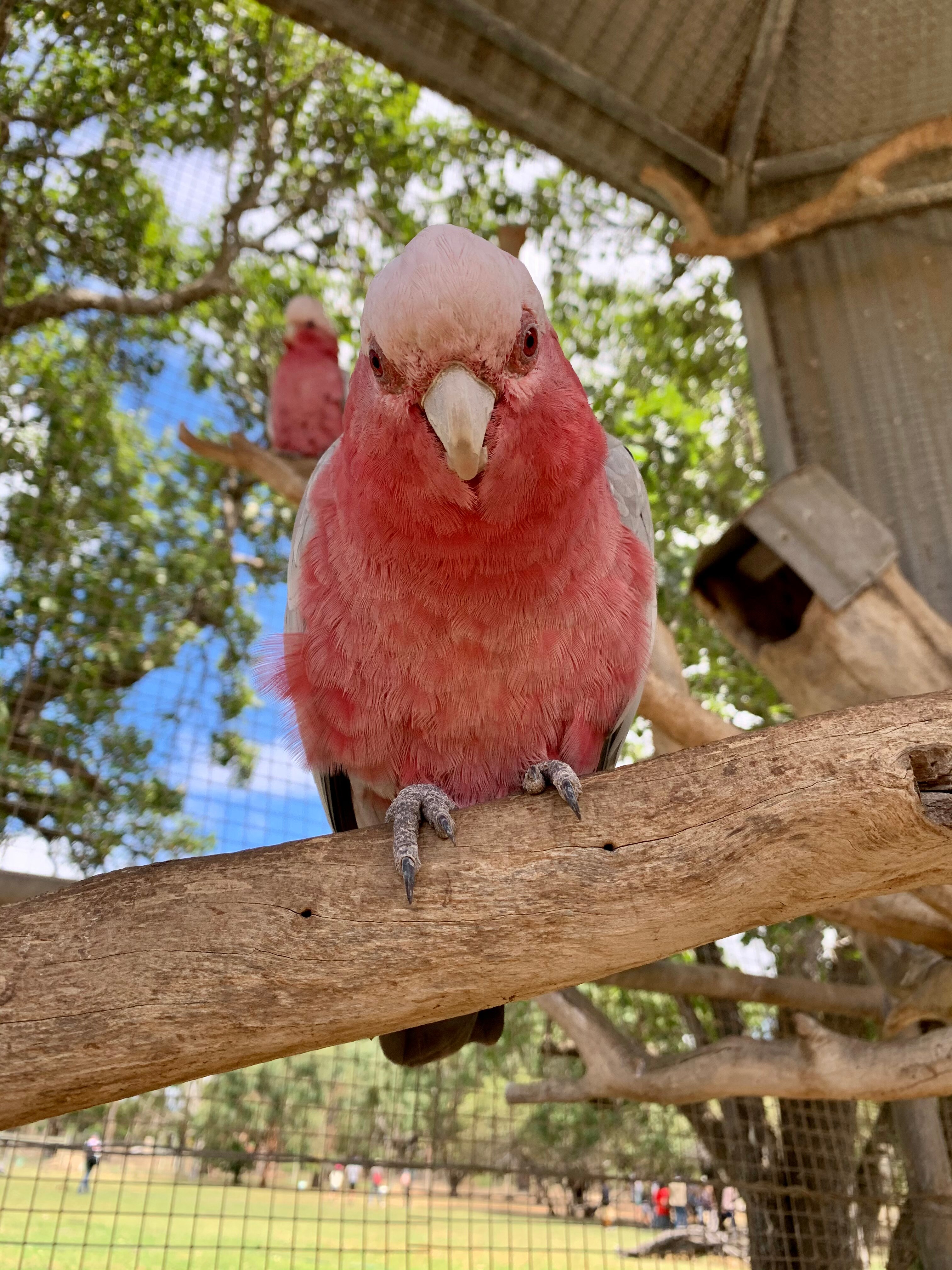 Bonded galah pair Maverick and Macey have called the enclosure home for more than 20 years and now share it with perennial third-wheel Callie, a single female galah, and a variety of other birds.
