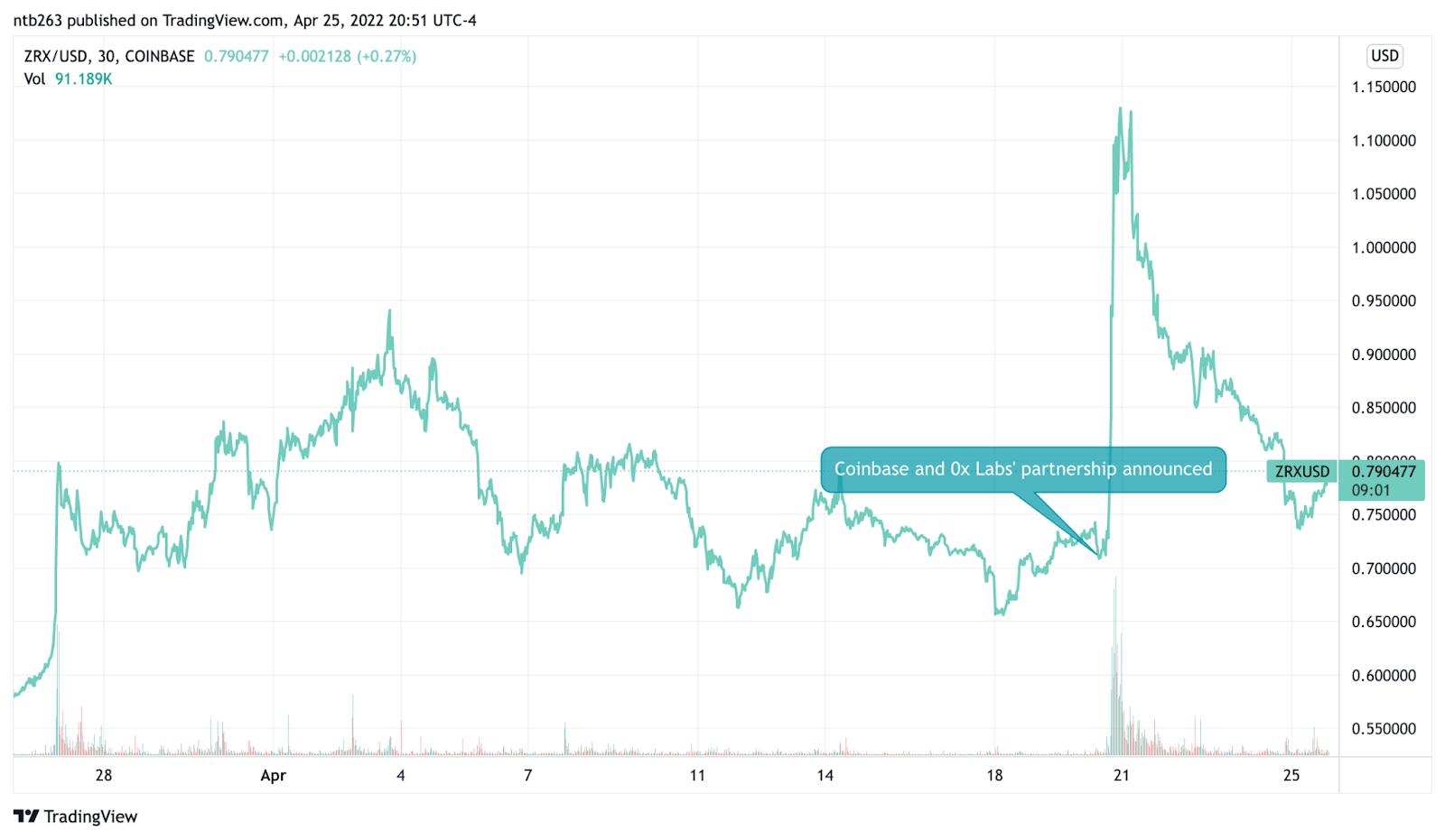 Following Coinbase’s announcement, the native token of 0x protocol, ZRX, rallied by over 50% to $1.10, its highest level since December. Its market capitalization rose by $300 million to top $930 million as well. The cryptocurrency has since retraced most of the gains but is still up by more than 20% over the past month.