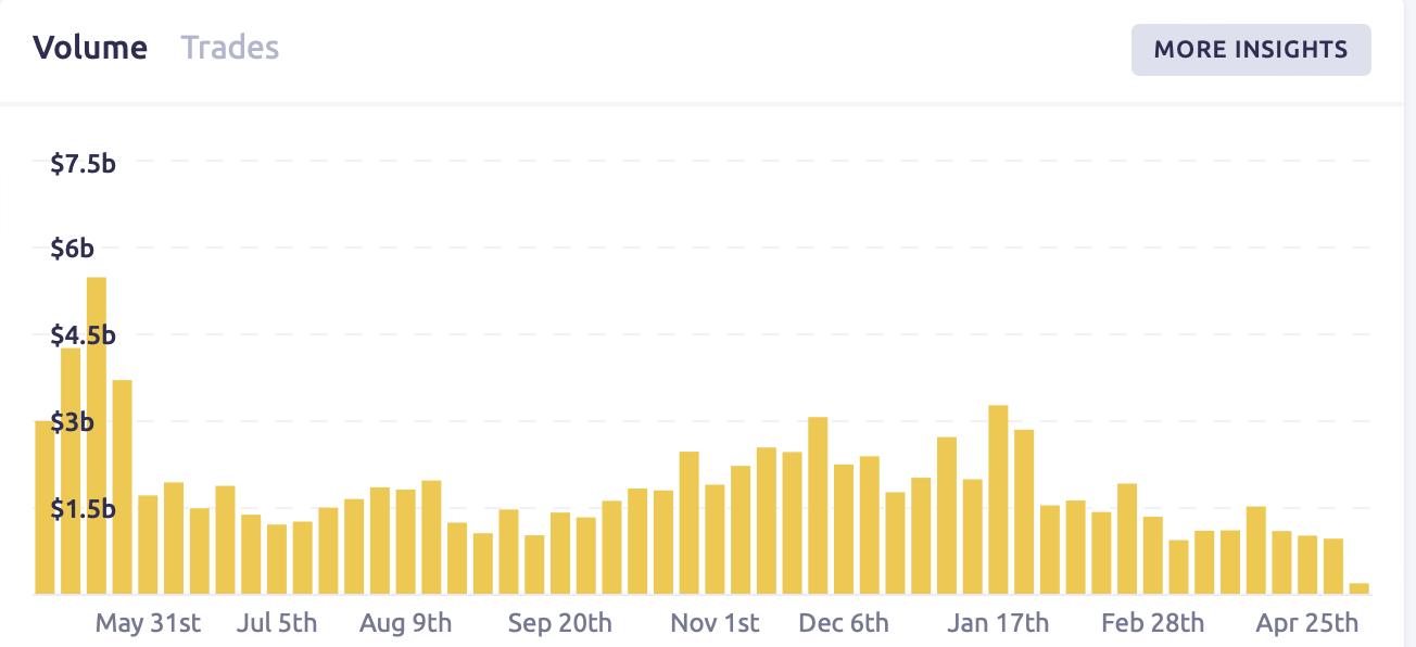 These numbers are relatively small compared to the largest decentralized exchanges, for instance last month industry-leader Uniswap handled almost $50 billion in transactions. By comparison, 0x handles an average of $1.5 billion in transactions on a weekly basis. It has been dropping this year, but that is in line with a broader industry trend of falling volume across all platforms.