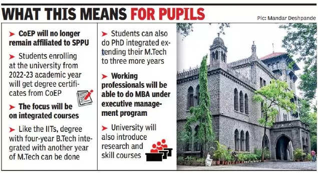 Accordingly, the institute will no longer remain affiliated to Savitribai Phule Pune University (SPPU) and students who enrol at CoEP Technological University from 2022-23 academic year will receive their degree certificates whenever they pass out of CoEP University. As a result, the focus will be on integrated M.Tech, PhD, B.Tech-MBA courses and the aim would be on research and skilling.