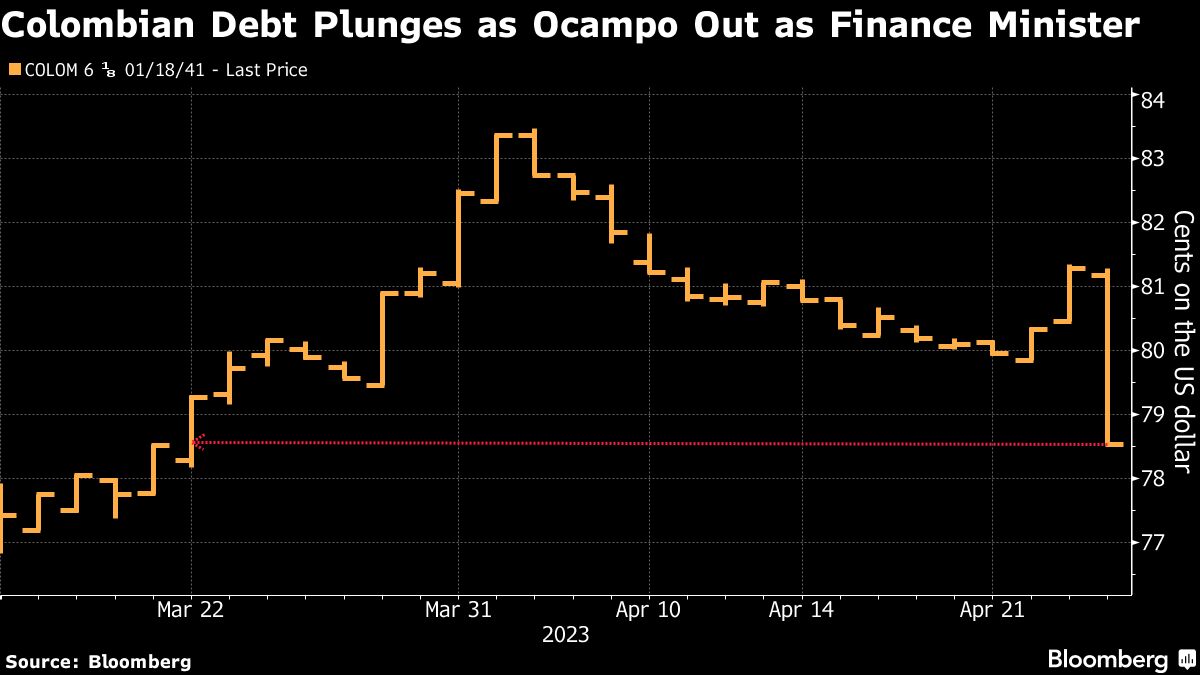 Colombia’s President Gustavo Petro ousted his market-friendly Finance Minister Jose Antonio Ocampo and replaced him with a close ally, sending bonds tumbling and the cost of insuring Colombia’s debt against default soaring.