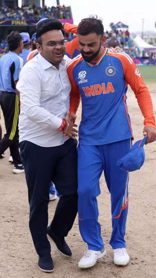 <p>India pacer Mohammed Siraj celebrated India's T20 World Cup victory in Barbados, proudly waving the tricolour in celebration.<br /></p>Reuters9/10:Jay Shah and Virat Kohli