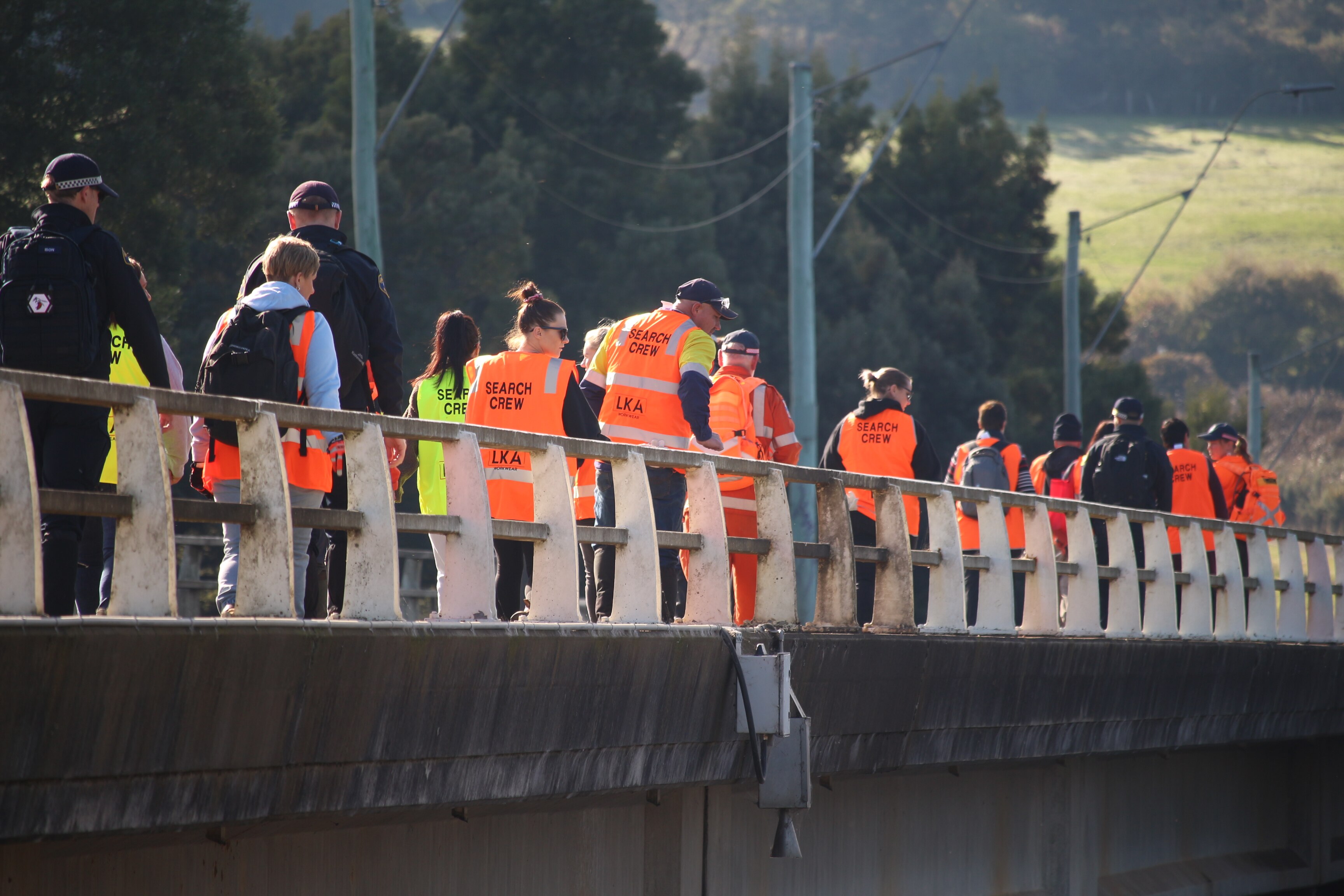 Searchers wearing high-vis "search crew" vests were seen crossing the bridge over the North Esk River, where Shyanne-Lee was last seen.