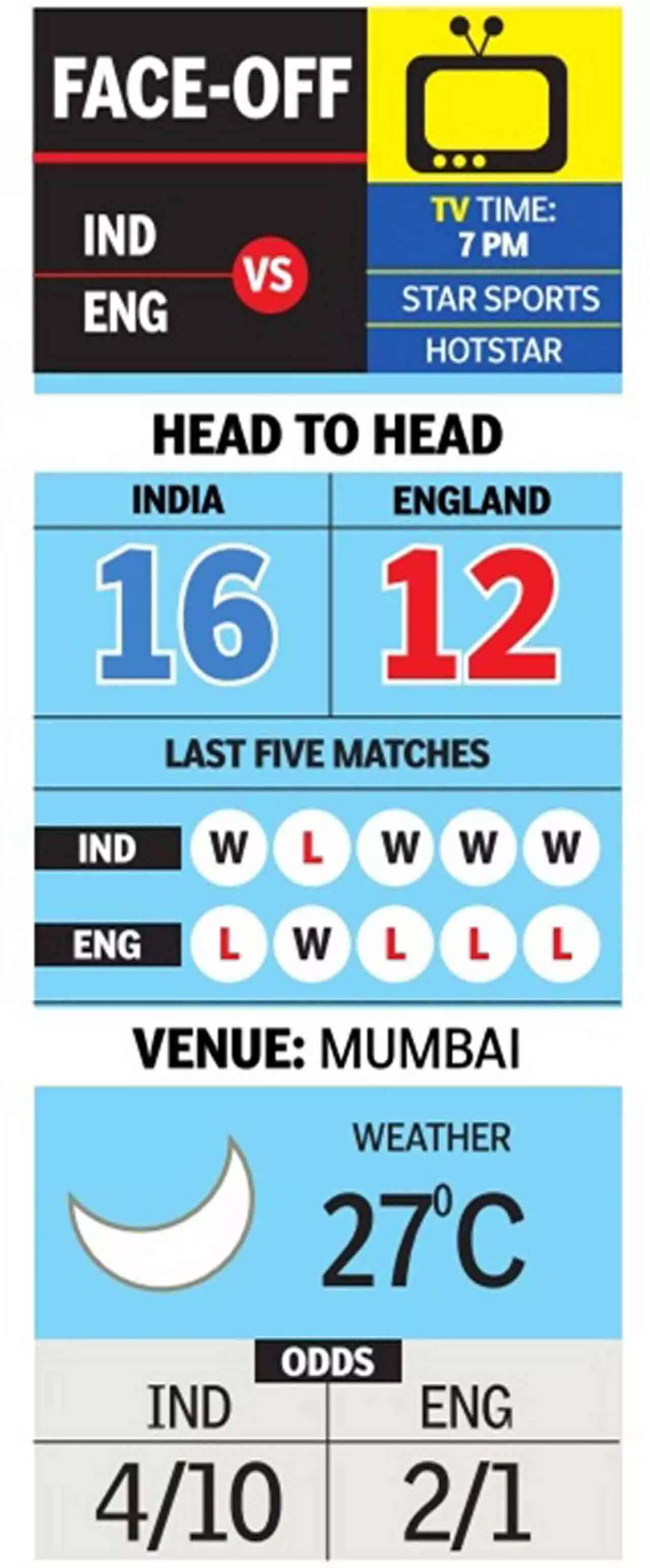 The venue is also one of Buttler's happy hunting grounds especially in the IPL where he has scored 700 runs in 21 games with a ton and three half-centuries at an average of 36.84 and a strike-rate of 146.75. What he will appreciate more is the fact that in white-ball cricket, spin is not a factor, especially under lights because of heavy dew. His batters have been woeful against spin.