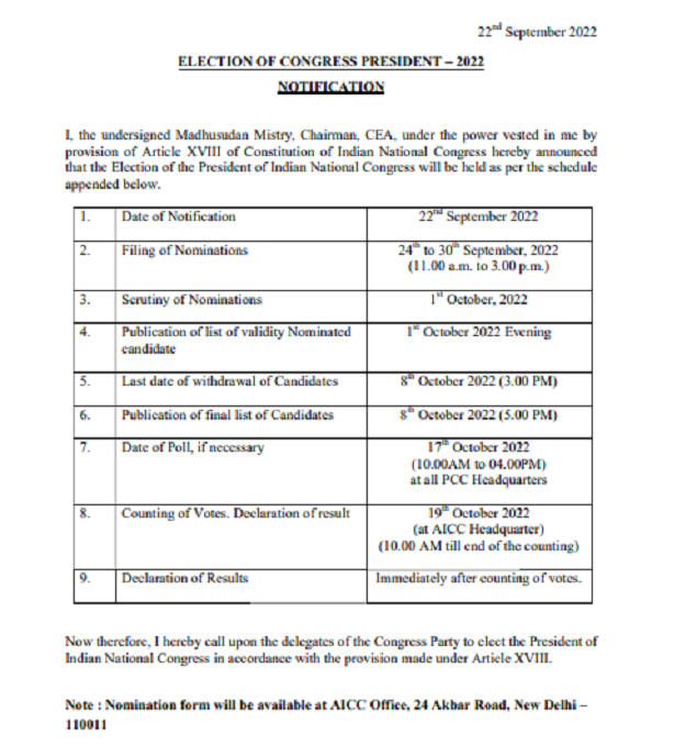 The nomination form will be available at the AICC Office, 24 Akbar Road, New Delhi, according to the notification.