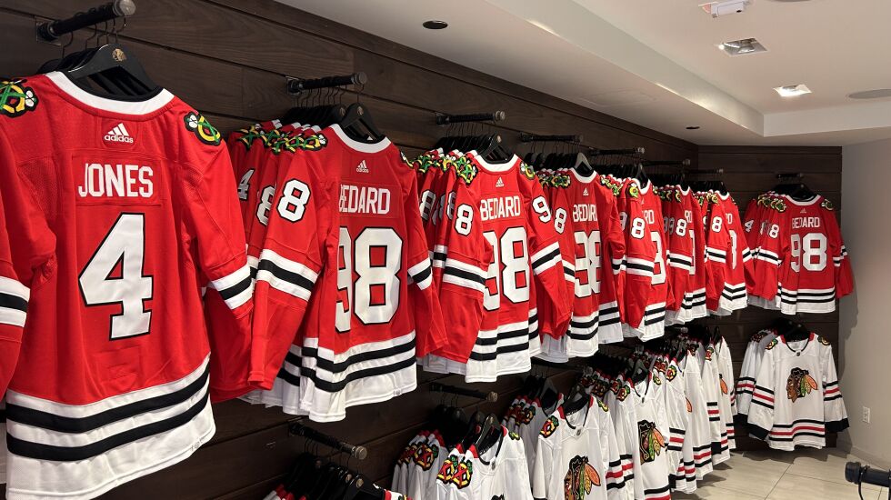 On the east wall of the Blackhawks Store on Michigan Avenue, seven of the eight jersey displays are dedicated to Connor Bedard.