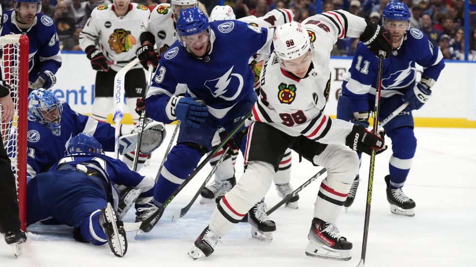 Kevin Korchinski earned his first career NHL goal thanks to a friendly ricochet off a Lightning skate, whereas Johnson and Perry’s goals were both their firsts against their former team. Goalie Petr Mrazek was stellar again, too, stopping 30 of 33 shots and helping the Hawks survive some sloppy defensive coverage sequences.