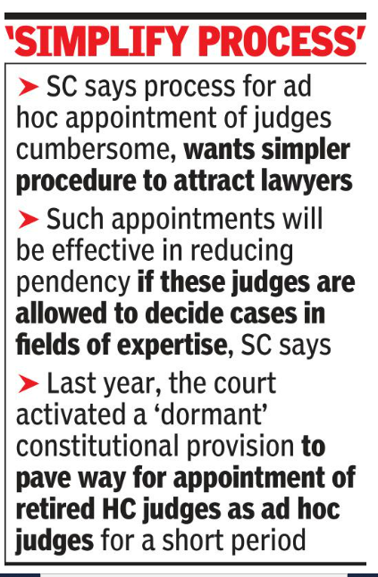 The bench said that the process for ad hoc appointment of judges in high courts is cumbersome, adding a simpler procedure should be adopted to make it effective and to attract lawyers. It also asked the AG and senior advocate Arvind Datar, who is assisting the court as amicus curiae, to have a re-look at the Memorandum of Procedure to suggest measures to simplify the procedure.