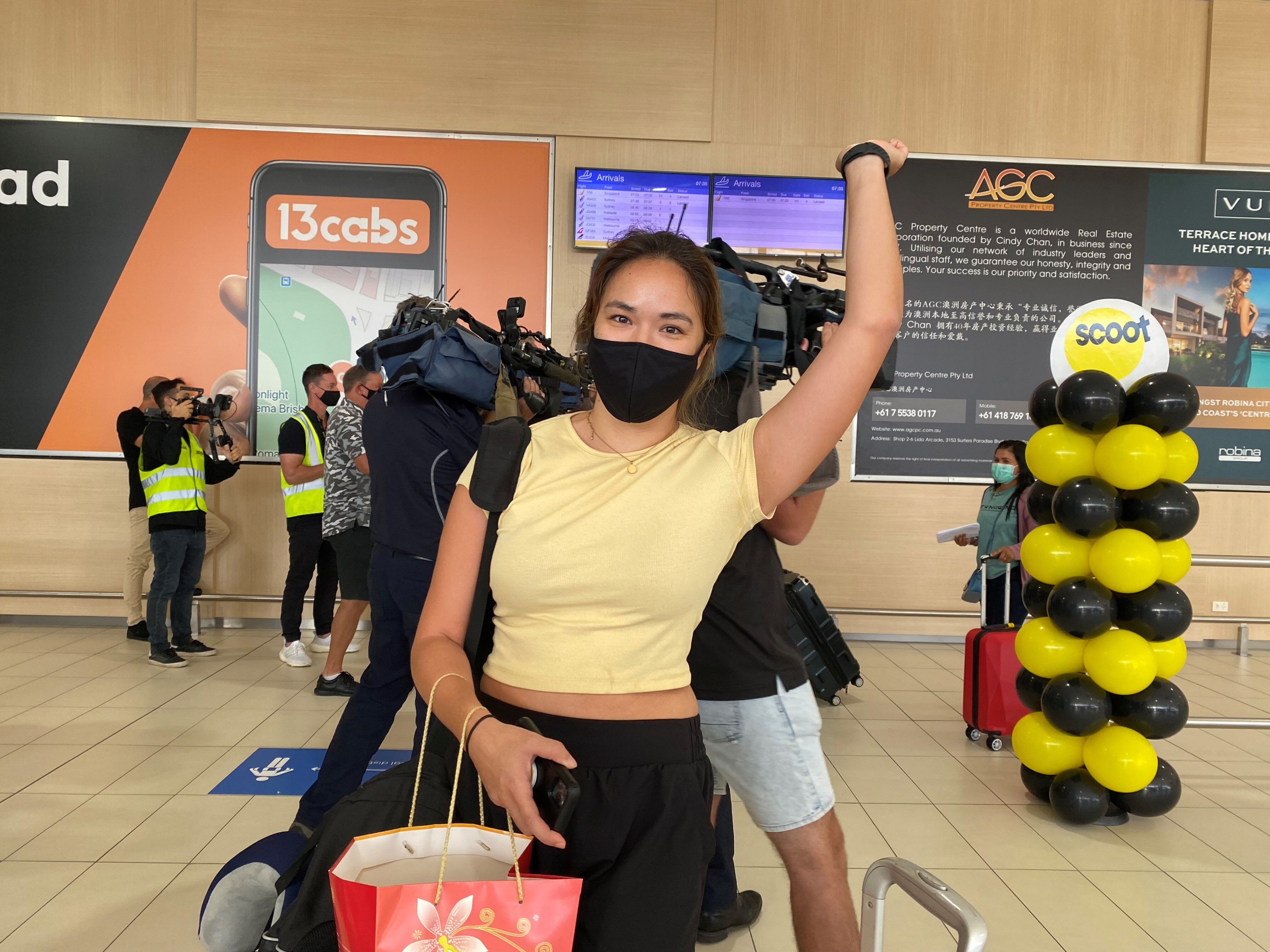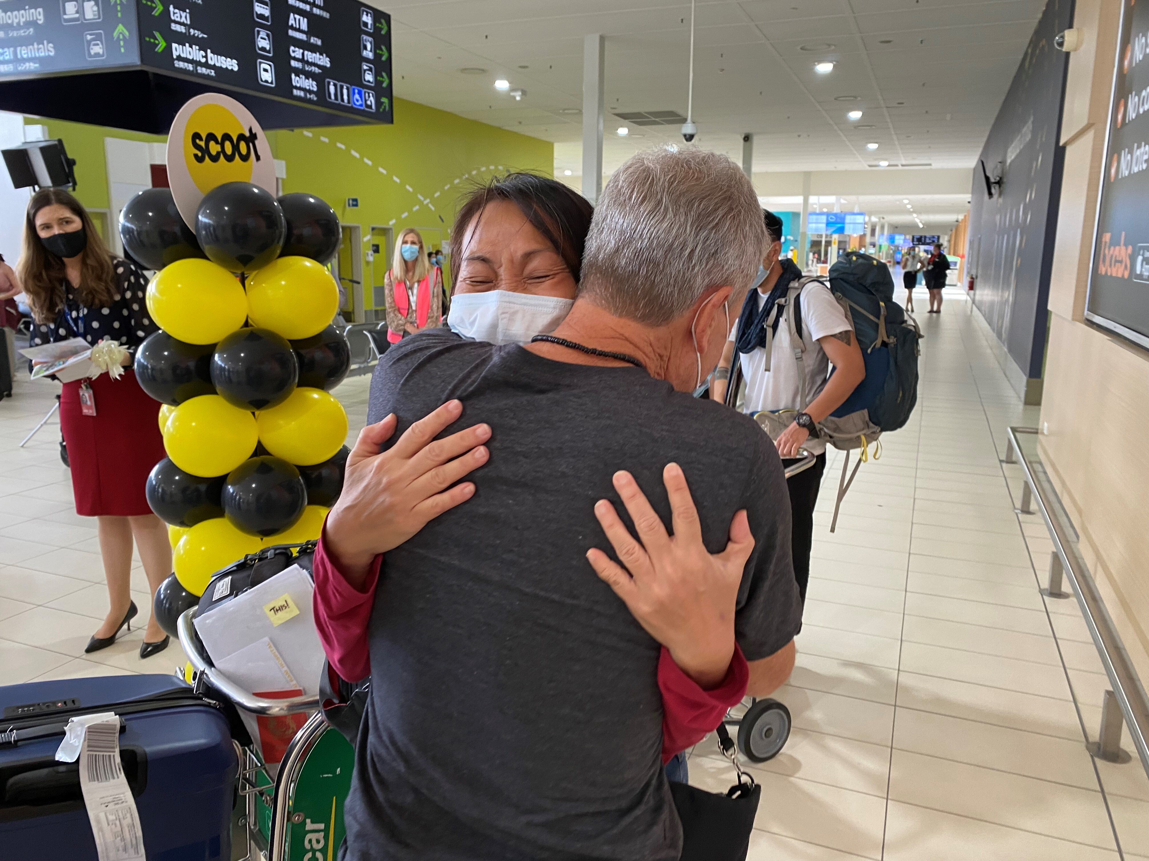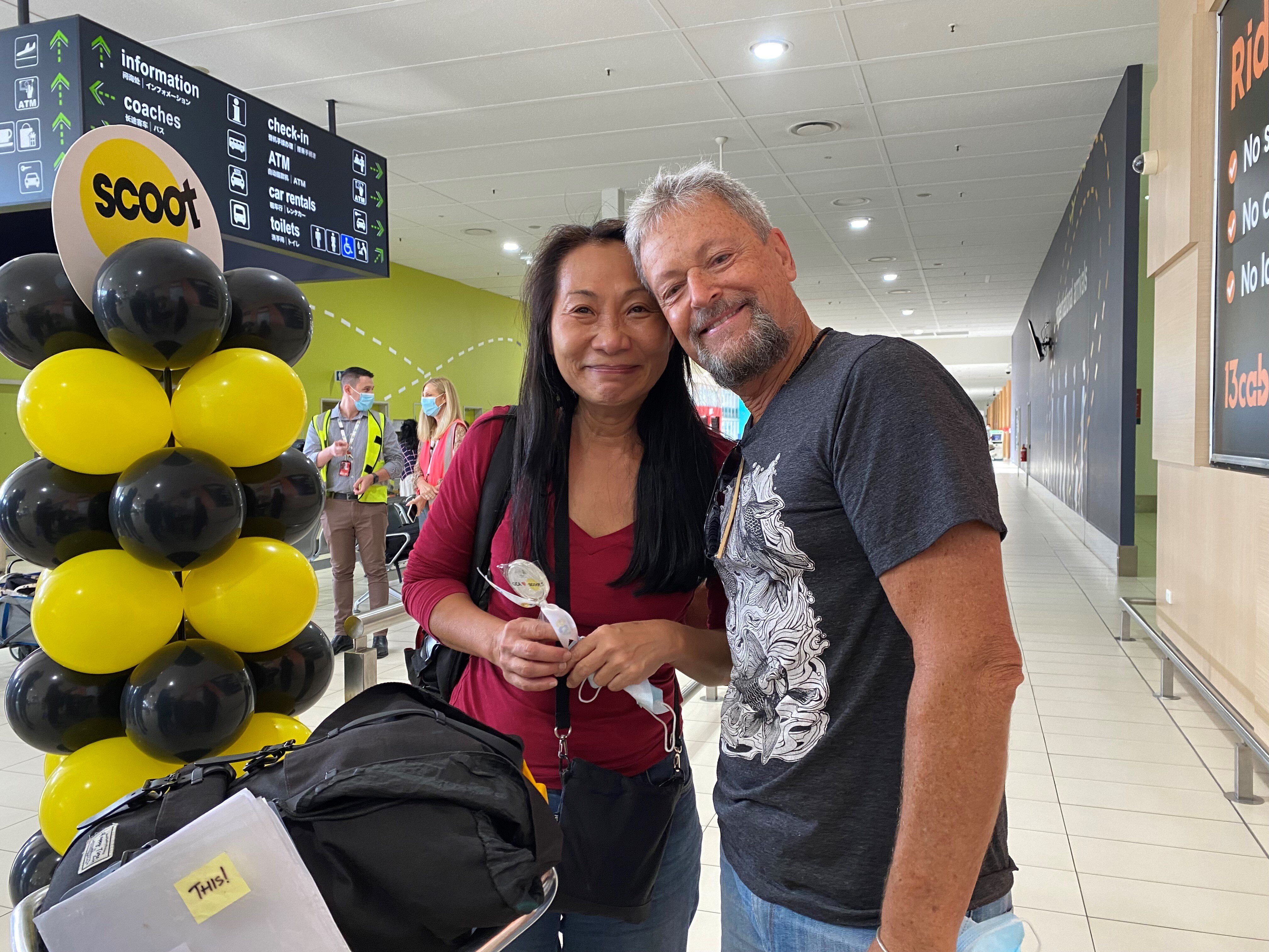Waiting at the arrivals terminal, John Gormley said he was "pretty nervous" to see his partner Lili Tan after almost two years apart.