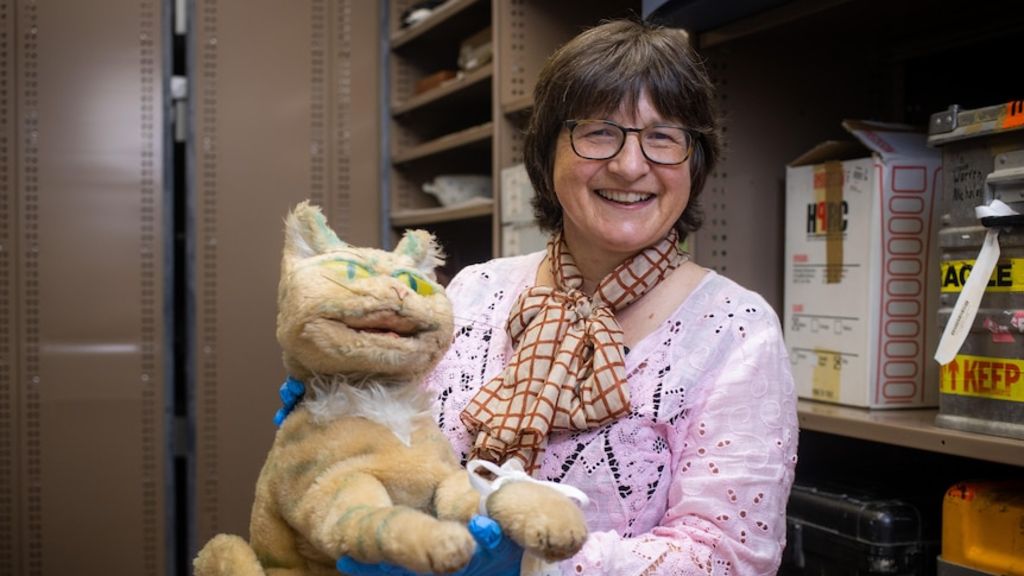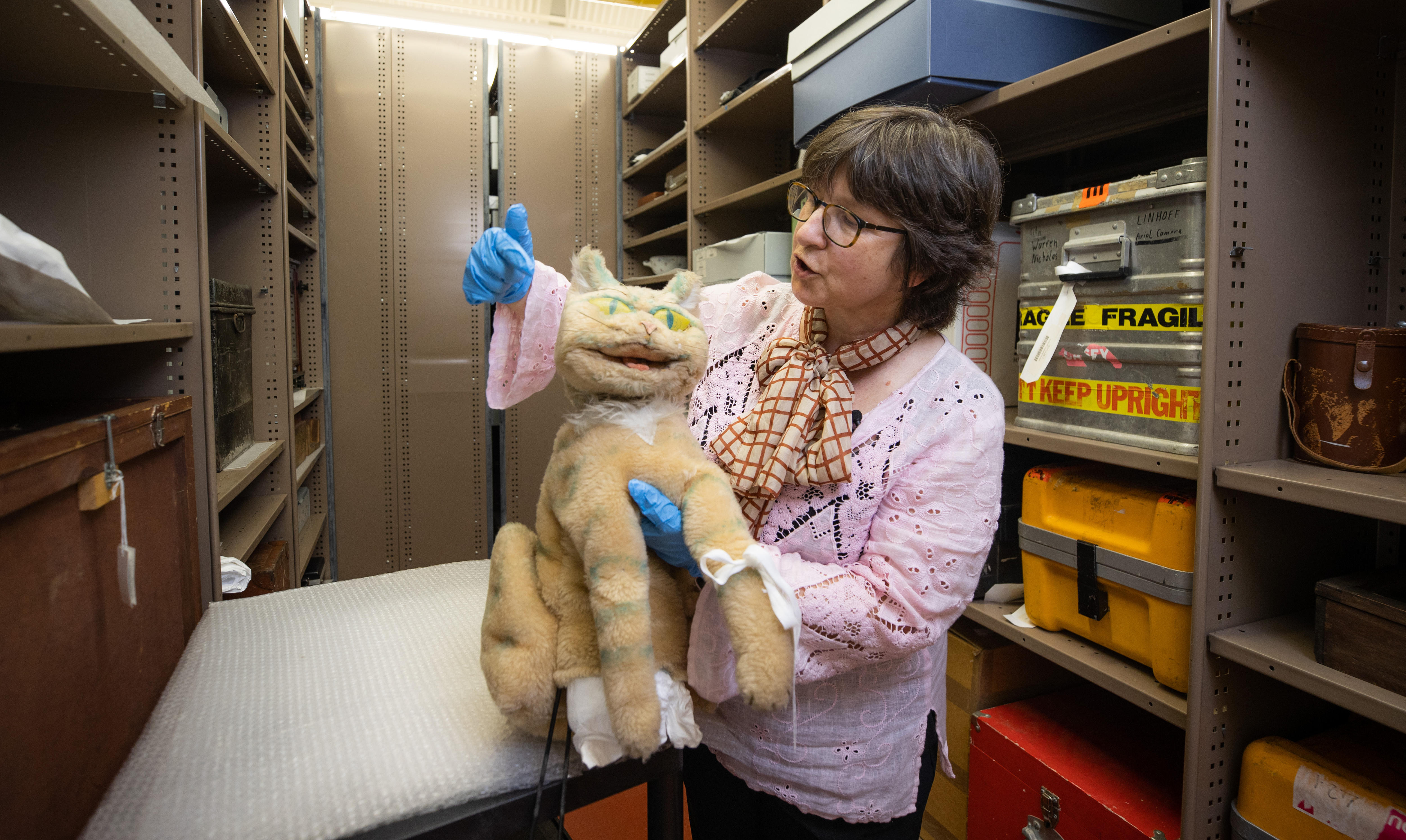 Ms Ross delicately lifts the slightly scary furry feline puppet from its shelf in the collection.
