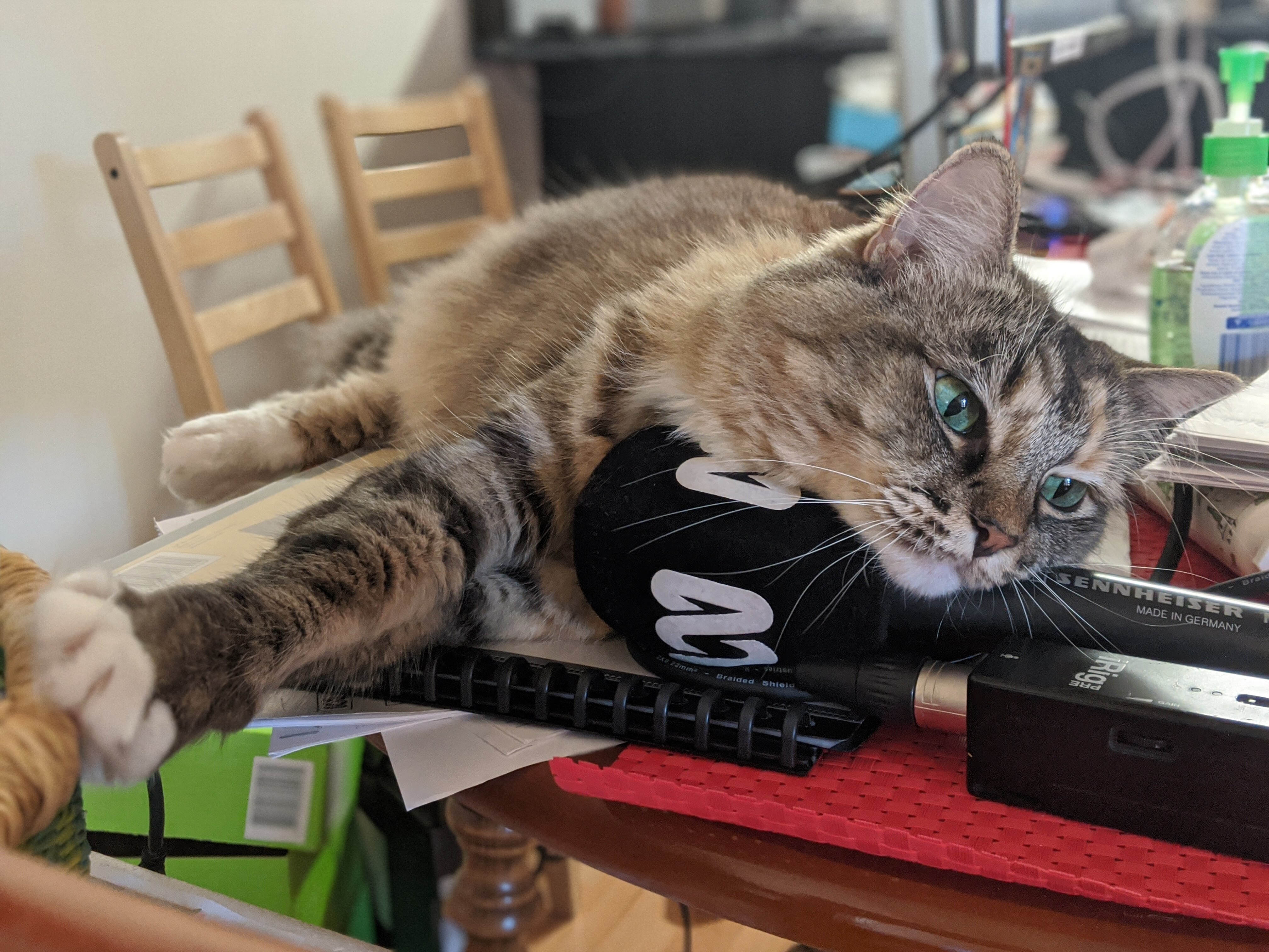 Mann snapped an equally humorous shot of her pet cat Arya sprawled across her desk in the first few days of working from home.