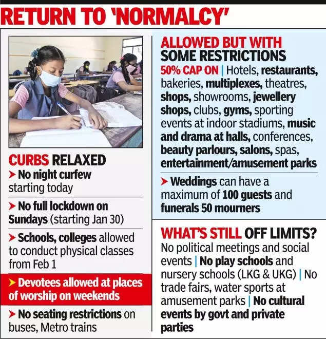 The state government, in its continuing efforts to curb the Covid-19 cases, retained the curbs such as allowing hotels, bakeries, theatres, multiplexes, music events, conferences, gyms, beauty parlours, salons to function with just 50% occupancy. There is no ban on usual practices and sports events will be allowed with 50% occupancy in indoor stadiums. All amusement parks and entertainment parks (except water sports) will be allowed to function with Covid-19 protocols and 50% capacity.