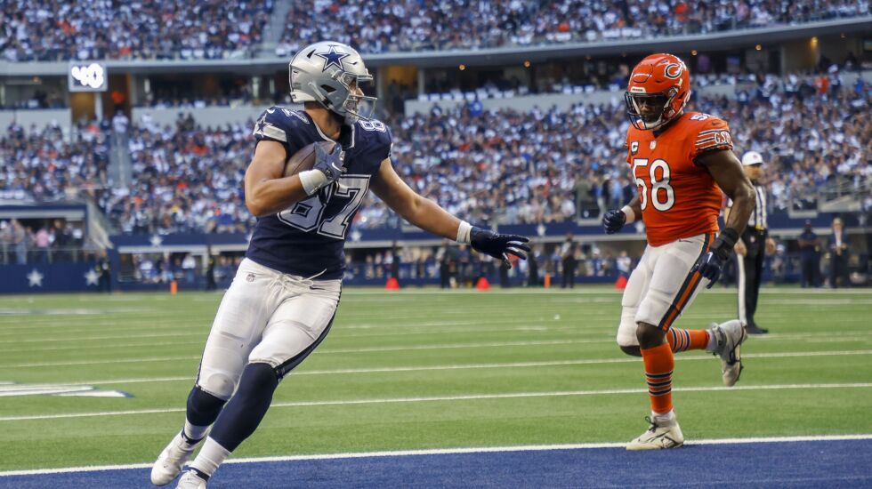 The Cowboys’ second touchdown came when CeeDee Lamb went in motion from right to left, and nobody picked him up. He caught a 21-yard pass as safeties Jaquan Brisker and Eddie Jackson scrambled futilely.