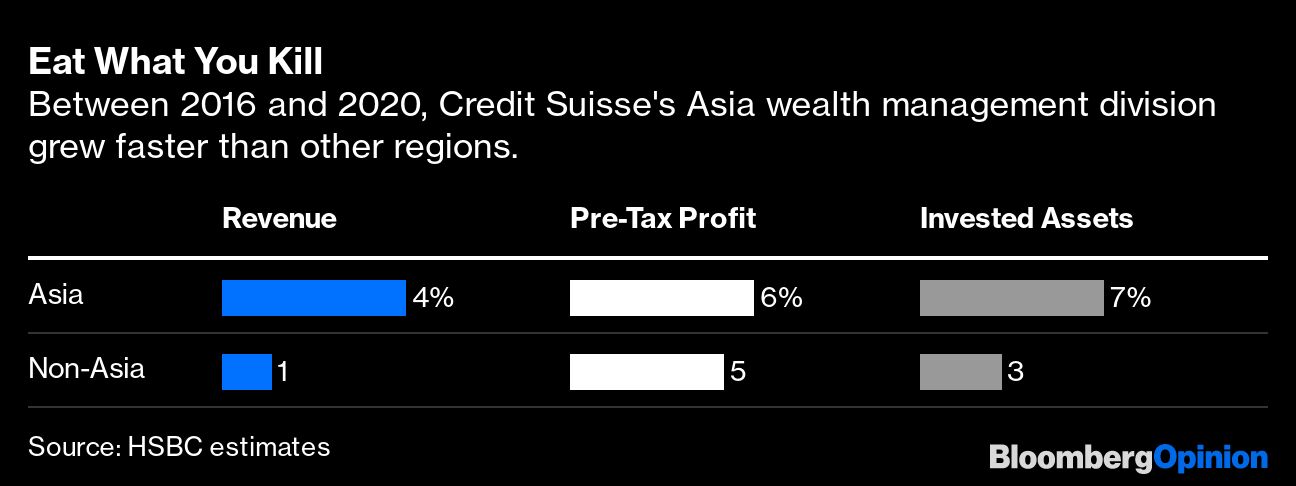 How Asians view the Swiss bank matters. Between 2016 and 2020, the region contributed one-third of the profit growth in its wealth management division, and 48% cumulative growth in invested assets, according to HSBC Holdings Plc. Hong Kong, Beijing and Singapore are among the top 10 cities where the super-rich — or those with more than $30 million in net worth — live. Credit Suisse can no longer brand itself as a global wealth manager without its rich Asians.