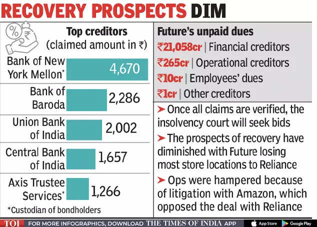 MUMBAI: Financial creditors to Future Retail have put in claims for Rs 21,058 crore, while operational creditors have sought another Rs 265 crore. Besides these, there are employee dues of Rs 9.8 crore and Rs 1.1 crore claims from other creditors.