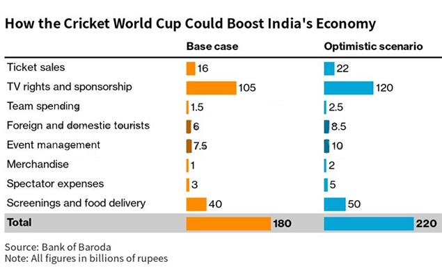 The Cricket World Cup may boost host country India’s economy by as much as 220 billion rupees ($2.6 billion), economists at Bank of Baroda estimate.