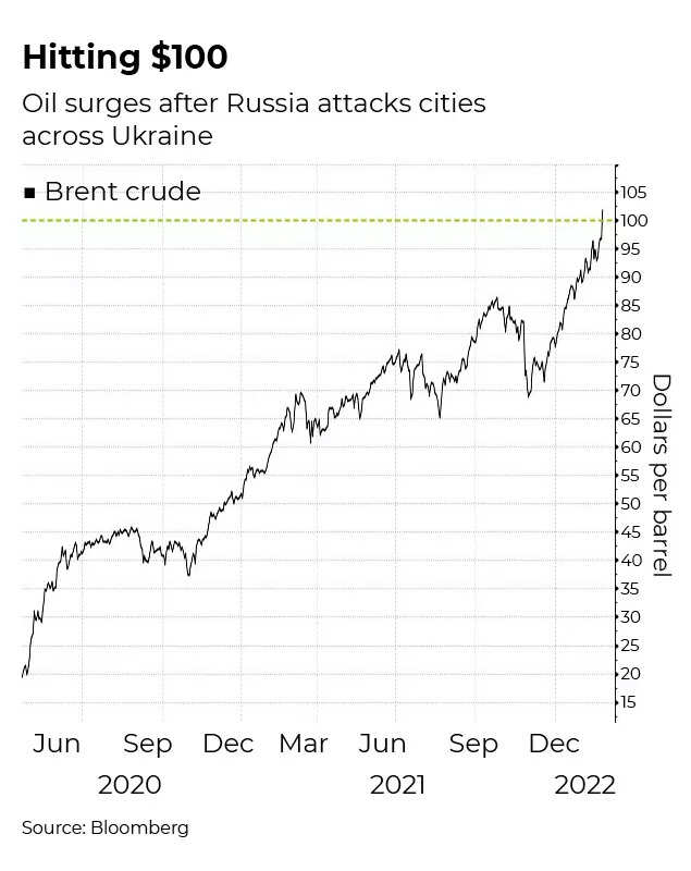 NEW DELHI: Brent crude prices rose above $105 a barrel for the first time since 2014, after Russia's attack on Ukraine led to concerns about disruptions in global energy supply.