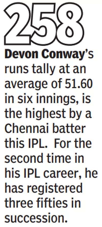 CHENNAI: He knows the conditions here like the back of his hand, and made sure he exploited all that the pitch offered to him. Ravindra Jadeja bowled a masterly four-over spell, choking the flow of runs and prising out three key wickets to restrict the Sunrisers Hyderabad to 134-7. Later, Devon Conway struck a free-flowing unbeaten half-century (77 runs off 57 balls, 12x4, 1x6) as the Chennai Super Kings romped home with 7 wickets in hand at the MA Chidambaram stadium on Friday night.