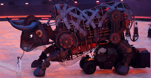 Then there was a gargantuan bull in the stadium, pulled along by overworked, underpaid female chain makers of the Industrial Revolution. Till the time the raging bull was there going on a rampage, it was the cynosure of all eyes at the glittering ceremony.