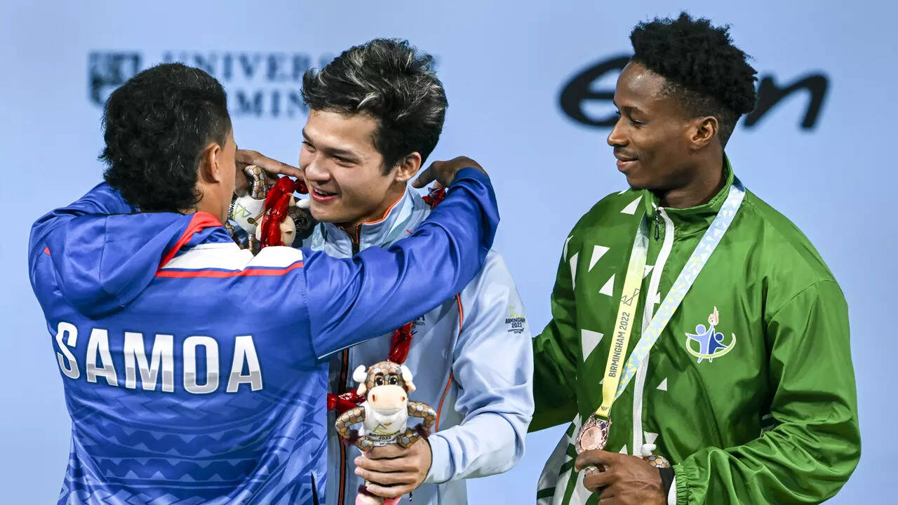 (Jeremy being garlanded by silver medalist Vaipava Nevo Ioane of Samoa as bronze medallist Nigeria's Umoafia Edidiong looks on - PTI Photo)