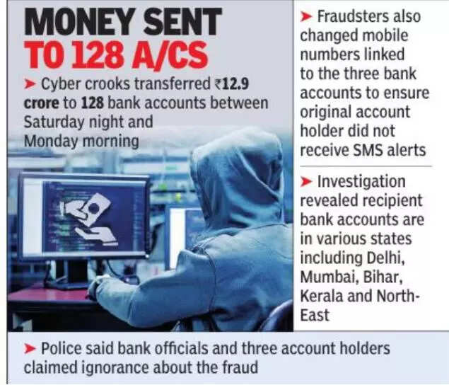 HYDERABAD: Cyber fraudsters who hacked into the server of Andhra Pradesh Mahesh Co-Operative Urban Bank Limited and took control of three accounts raised the original balance in them to crores, police have found. The cyber crooks had transferred Rs 12.9 crore to 128 bank accounts across the country between Saturday night and Monday morning.