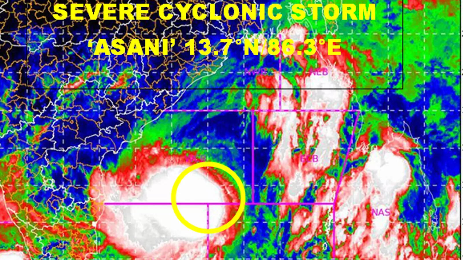 The Severe cyclonic storm ‘Asani’ (pronounced as Asani) over westcentral and adjoining south Bay of Bengal moved nearly northwestwards with a speed of 25/kmph during past six hours and laid centered about 920km northwest of Car Nicobar (Nicobar Islands), 770km westnorthwest of Port Blair (Andaman Islands), 500km southeast of Visakhapatnam (Andhra Pradesh) and 650km south of Puri (Odisha).