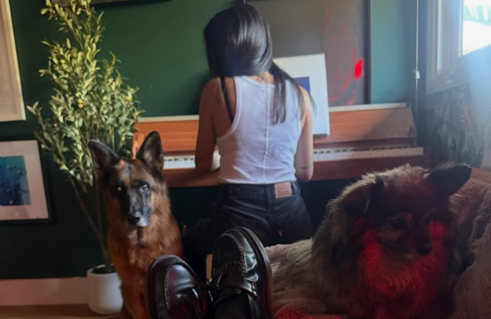 The woman had her back to the camera while she played the piano.
