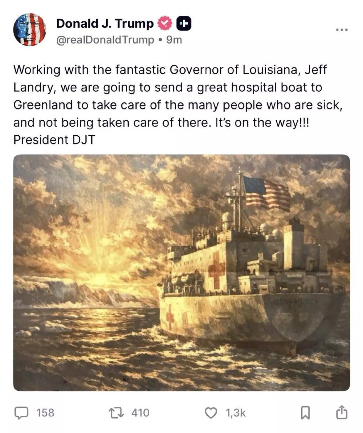 In a post on his Truth Social platform, he said he was coordinating with Louisiana Governor Jeff Landry, his special envoy for Greenland, to deploy a medical vessel to assist locals.