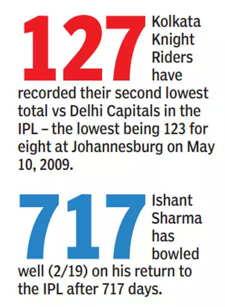 NEW DELHI: It’s been a while since Ishant Sharma has bowled in a high-profile match. On Thursday night, as the steady drizzle stopped half an hour after scheduled start of play, Delhi Capitals decided to finally unveil him for the first time in the season after winning the toss against Kolkata Knight Riders. And when the second ball of the match pitched on a back of a length and left Jason Roy, Ishant turned back the clock. And that set the tone for his comeback spell of 2/19 and the beleaguered Capitals to choke and restrict KKR to 127/9 for their first win of the season.