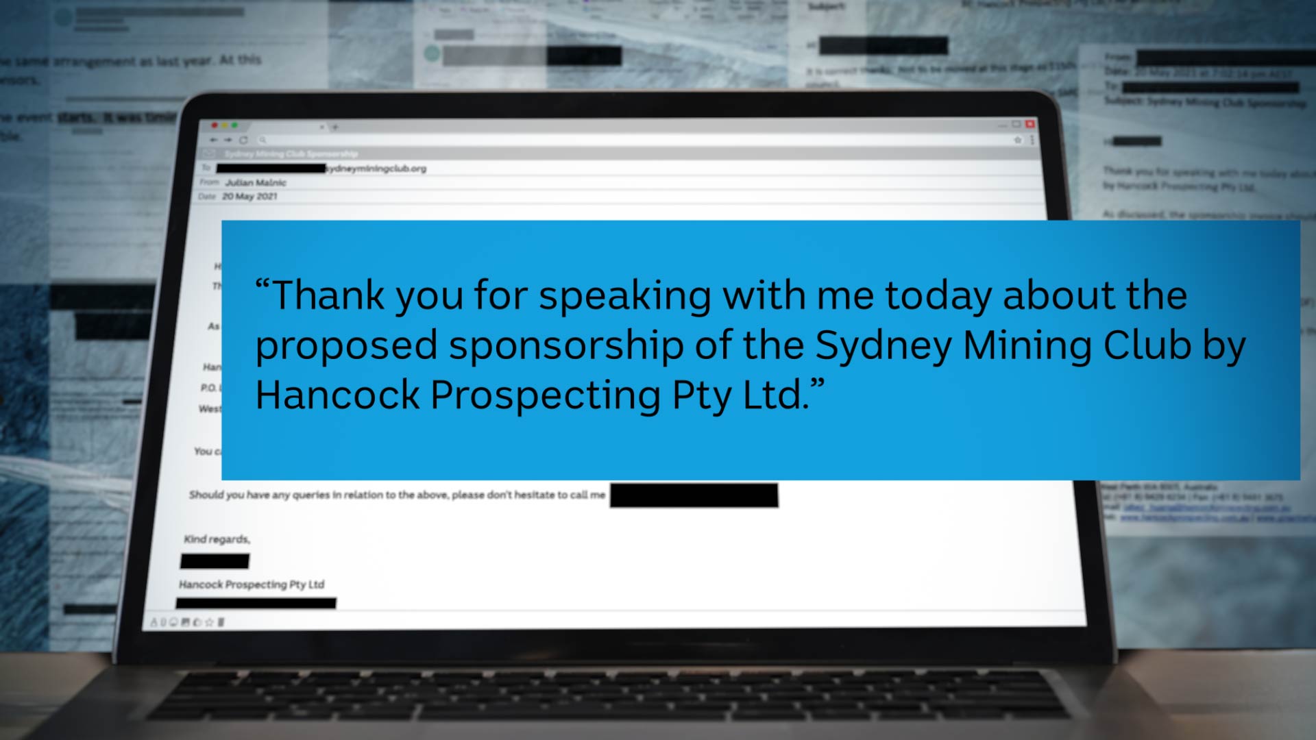 May 20, 2021: Hancock Prospecting CFO emails Sydney Mining Club Chairman Julian Malnic. "Hi Julian, Thank you for speaking with me today about the proposed sponsorship of the Sydney Mining Club by Hancock Prospecting Pty Ltd … As discussed, the sponsorship invoice should be addressed to [Hancock Prospecting Pty Ltd].