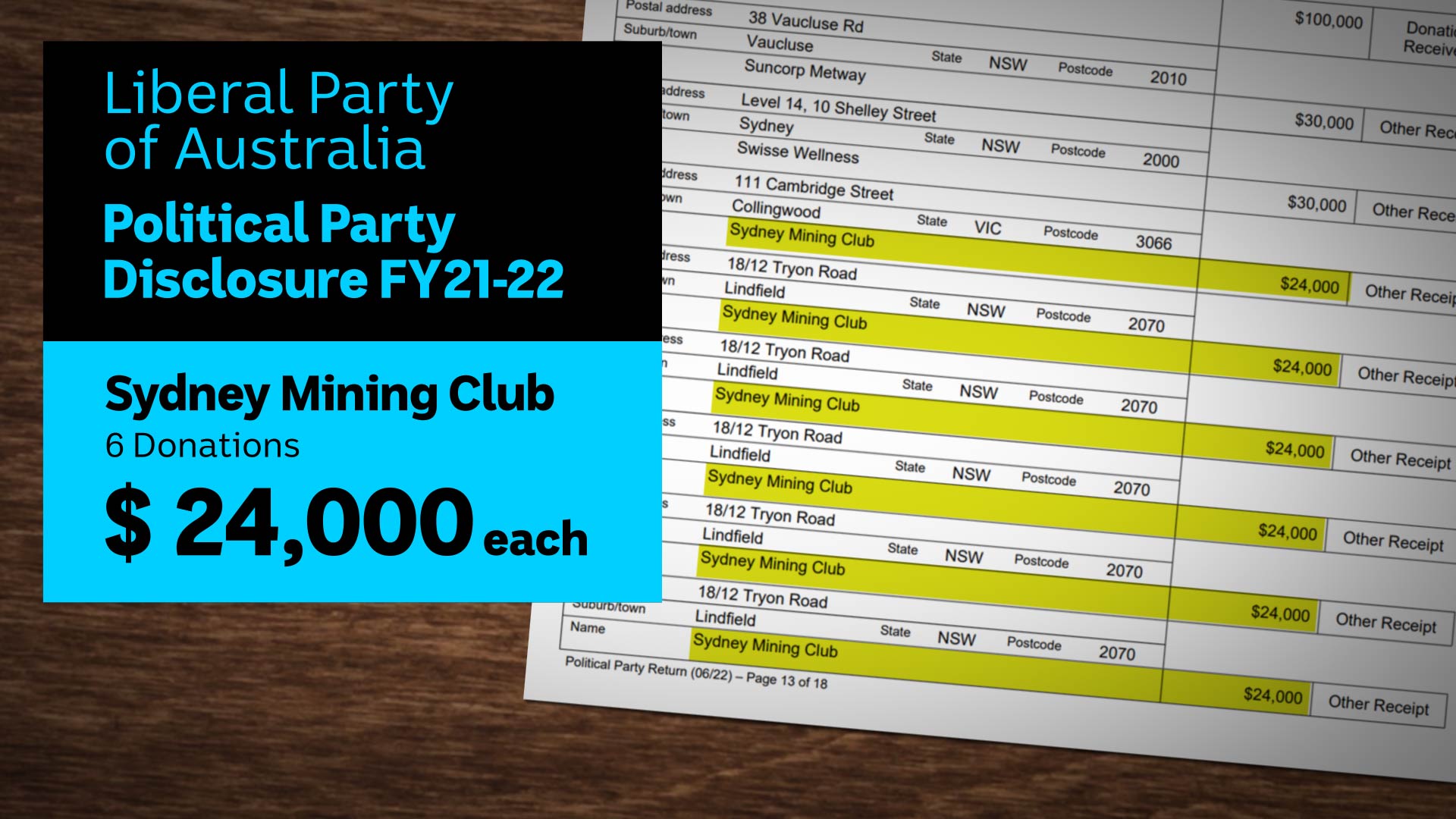 The ABC has seen evidence that over that period, the Sydney Mining Club paid a total of $300,028 to the Liberal Party.