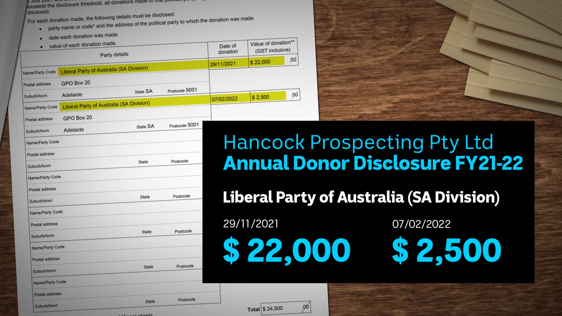 Hancock Prospecting declared two donations worth a total of $24,500 made by its subsidiary, S Kidman and Co, to the South Australian branch of the Liberal Party.