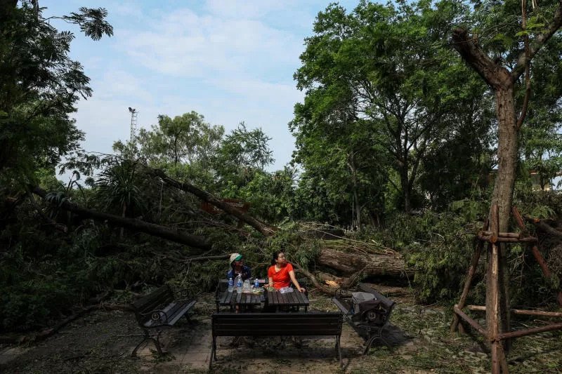 People rest near a fallen tree inside a park, following heavy rain and strong winds on Friday, in Bangkok, Thailand, on Oct 4, 2025. (Photo: Reuters)