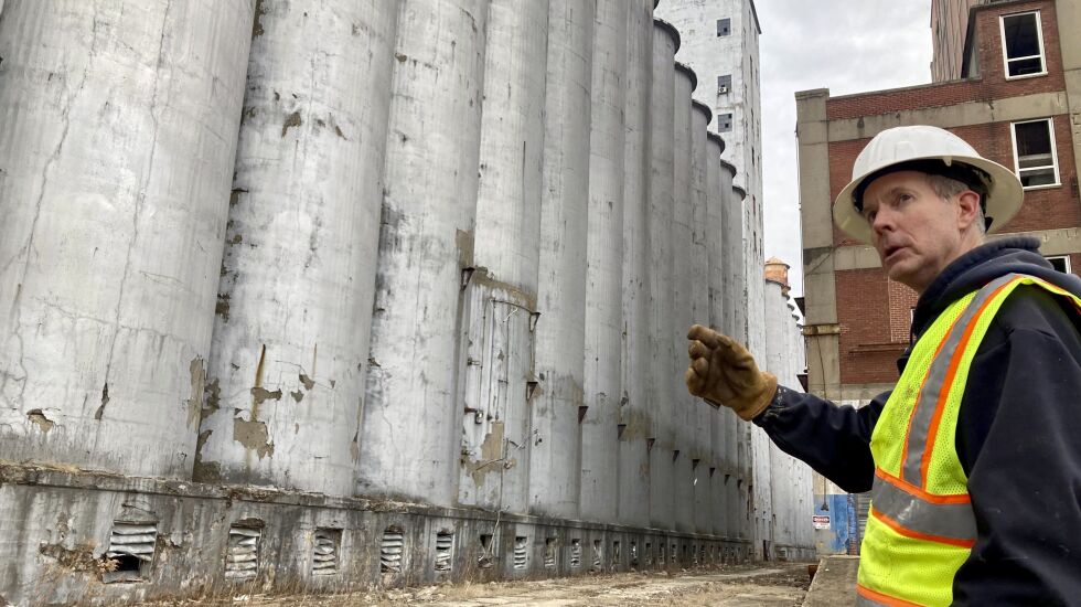 Now, all that’s left is to sweep up the remaining asbestos and lead paint chips before pulling down more than 500,000 square feet of factory, including a 242-foot headhouse that’s the city’s third-tallest structure and 160 silos, four abreast and standing 100 feet.