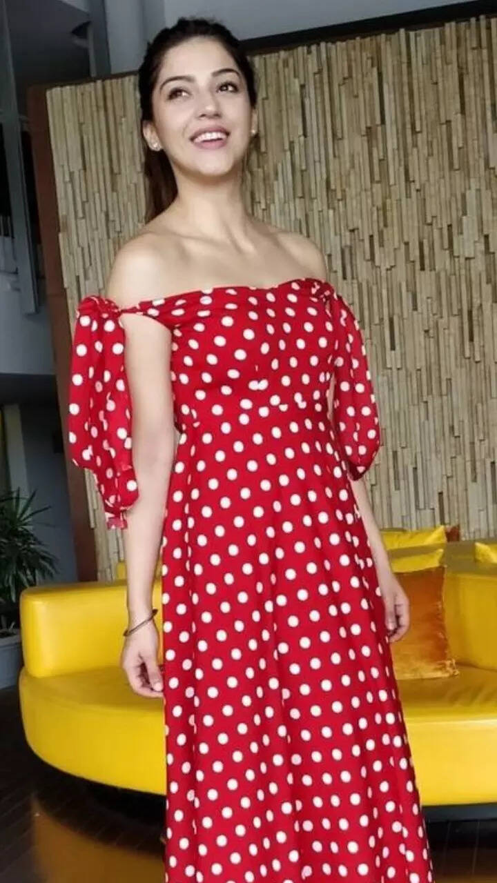 Mehreen Pirzada picked a red dress that was patterned with white polka dots.