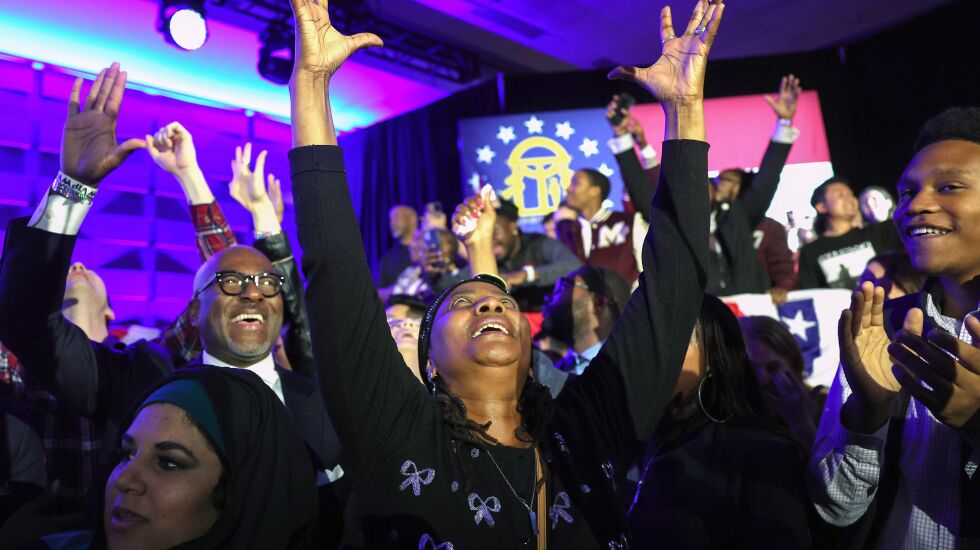 Supporters cheer as the George Senate runoff election is called for Democratic Sen. Raphael Warnock at the Warnock election right watch party at the Marriott Marquis in Atlanta, Georgia. (Win McNamee/Getty Images)