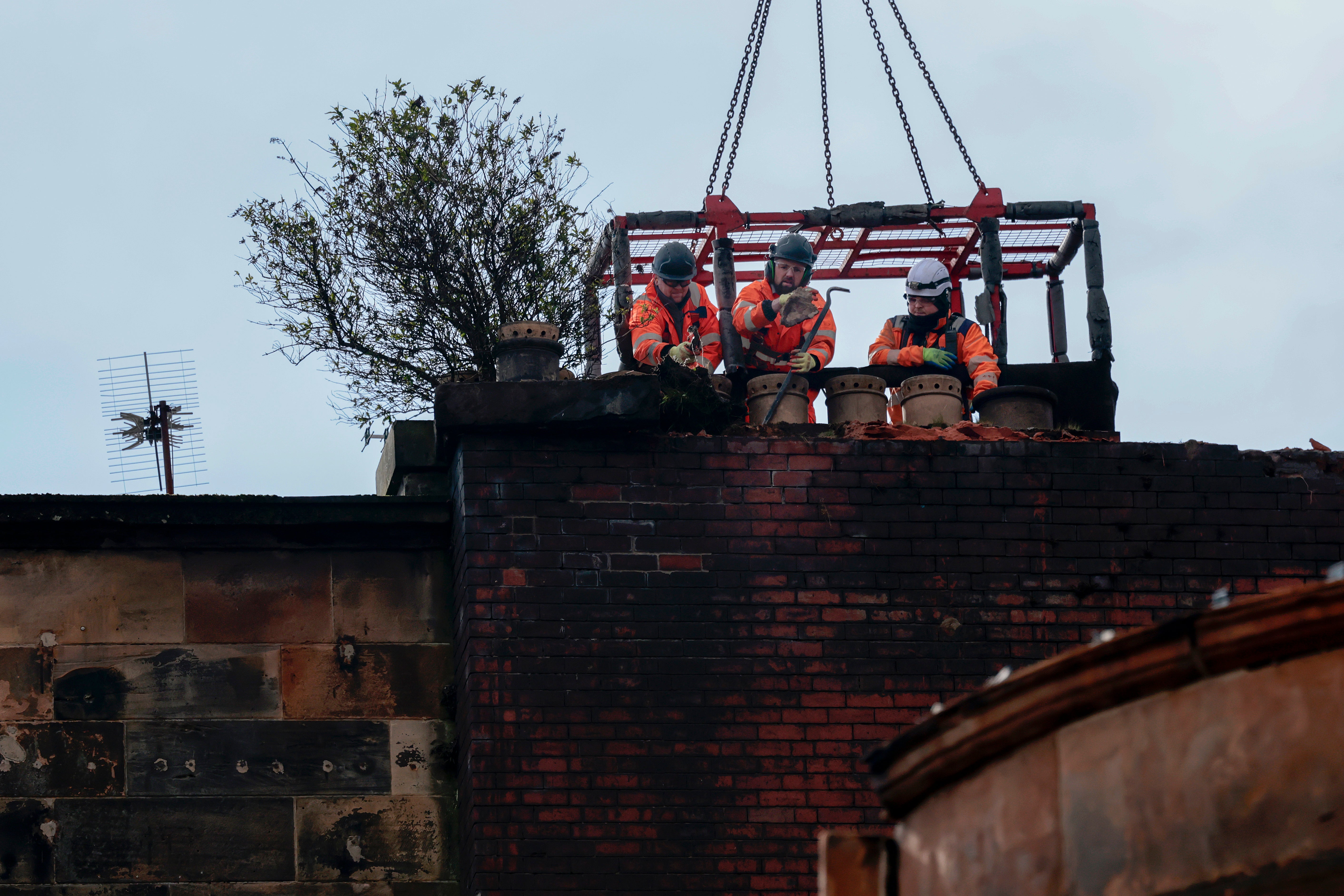 Workers could be seen in a cage suspended from a crane dismantling the remains of a chimney stack on a neighbouring building.