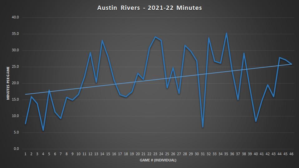 In the chart above, which does not include the games Rivers missed due alternately to health and safety protocols, injury or coach’s decision, it can quickly be seen both the extent to which his playing time has fluctuated, but more importantly that the overall trend has been toward increased minutes. In the early season before contracting COVID (games one through 18 on the chart), Rivers averaged 17.5 minutes, which has increased to 23.6 minutes since his return.