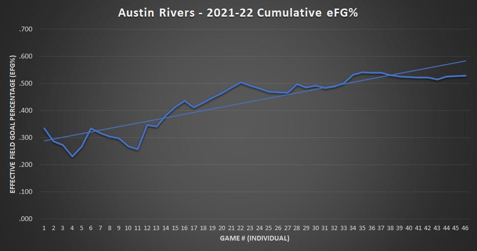 And while there may be some push-and-pull to this (it’s helpful for shooters to get into a rhythm if they have consistent playing time), part of the reason for this is that he’s found his way to better shooting efficiency over the course of the season. Rivers’ effective field goal percentage, which accounts for the higher value of three-point shots, is at 54.5% this season, which puts him in the 66th percentile for his position, according to Cleaning the Glass. And although this may not be an elite number, it’s perfectly respectable for a bench guard or wing, and puts him right on par with starter Will Barton (53.9%) and shooting specialist Bryn Forbes (54.1%)