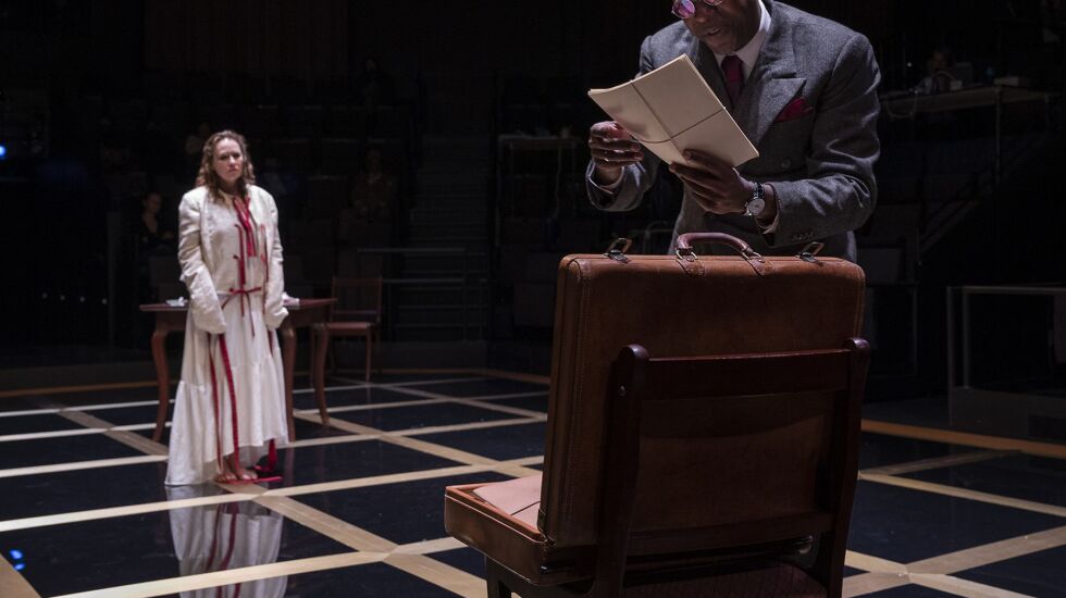 In a bit of artistic wish fulfillment, the most entertaining scenes in what is an overlong show at nearly three hours involve Davis’ character being mildly humiliated by the women in the play, one scene involving a wildly outlandish meal and the other a game of who will get frightened first.