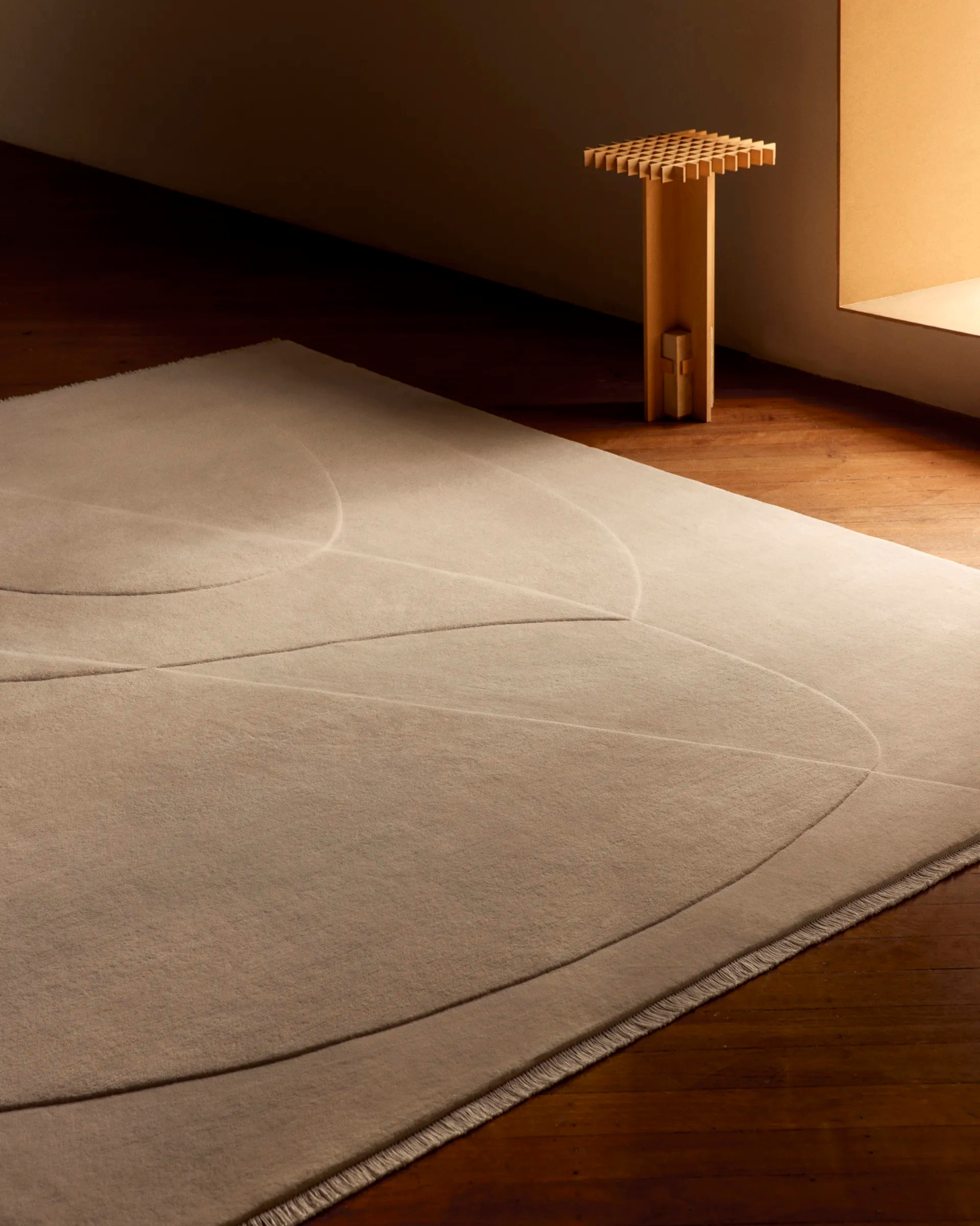 Shearing and trimming to create piles and patterns isn’t new. But in The GAIA Collection, a collaboration between Armadillo Rugs' and the Barcelona-based artist Carla Cascales Alimbau, the act of carving felt particularly fresh. Partly inspired by her layered resin paintings, Alimbau translated eroded landscapes — like coastlines shaped by the tide — into an earth-toned series that reverses her typical process. “We were cutting the material to get these waves and these shapes, so it was working the other way around — not adding material, but taking out the material,” said Alimbau. The result is subtle and sculptural, with smooth organic reliefs drifting across the surface.