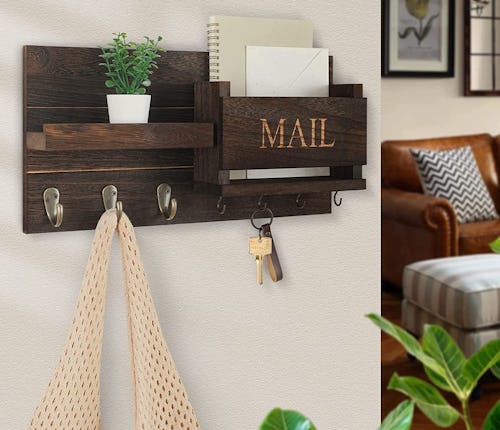 Loose mail and missing keys create instant entryway chaos. This wall-mounted organizer adds a dedicated landing zone with a letter holder, sturdy hooks, and a shelf for wallets or sunglasses. Made from thick wood, the organizer is designed to hold up to 20 pounds. It mounts easily with the included hardware, keeping daily essentials visible, organized, and easy to grab. You can get the holder in five colors.