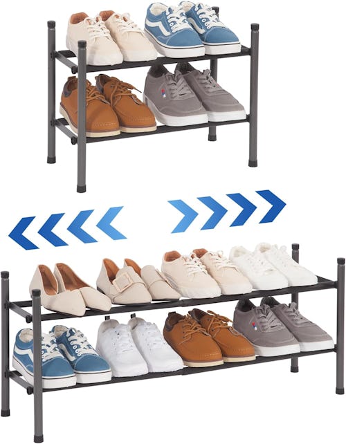 When shoes don’t have a home, chaos follows. This expandable metal shoe rack adjusts up to 32 inches to hold up to eight pairs of shoes. It can even be stacked vertically as your shoe situation grows. The shelf is designed to be lightweight but sturdy and fit neatly in small entryways, closets, or hallways.